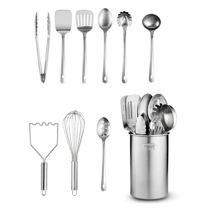 - ALL SET - This 10-piece utensil set is perfect for any master chef. Our kitchen set includes basting, slotted, and spaghetti spoons, as well as a potato masher, whisk, and tongs, all presented in a chic kitchen utensils holder.