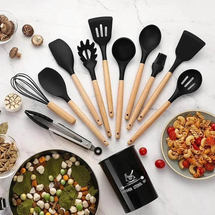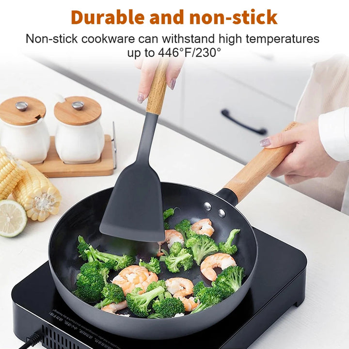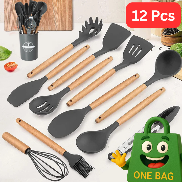 Experience the perfect blend of style and functionality with our 12 Pcs Non-Stick Silicone Cooking Utensils Spatula, Tong, Whisk Set. Made with high-quality silicone and a sturdy wooden handle, our kitchen tools provide exceptional heat resistance and durability. Perfect for apartments, college dorms, and camping supplies.