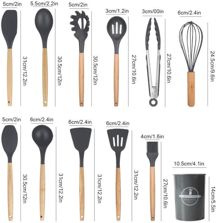 - 12 Kitchen Utensils Set: The 12 professional silicone kitchen utensil set includes solid turner, basting brush, slotted turner, pasta server, deep soup ladle, solid spoon, slotted spoon, egg whisk, spatula, spatula spoon, tong, utensil holder.