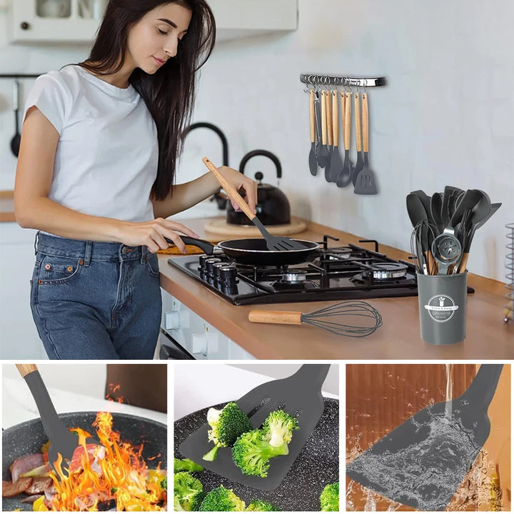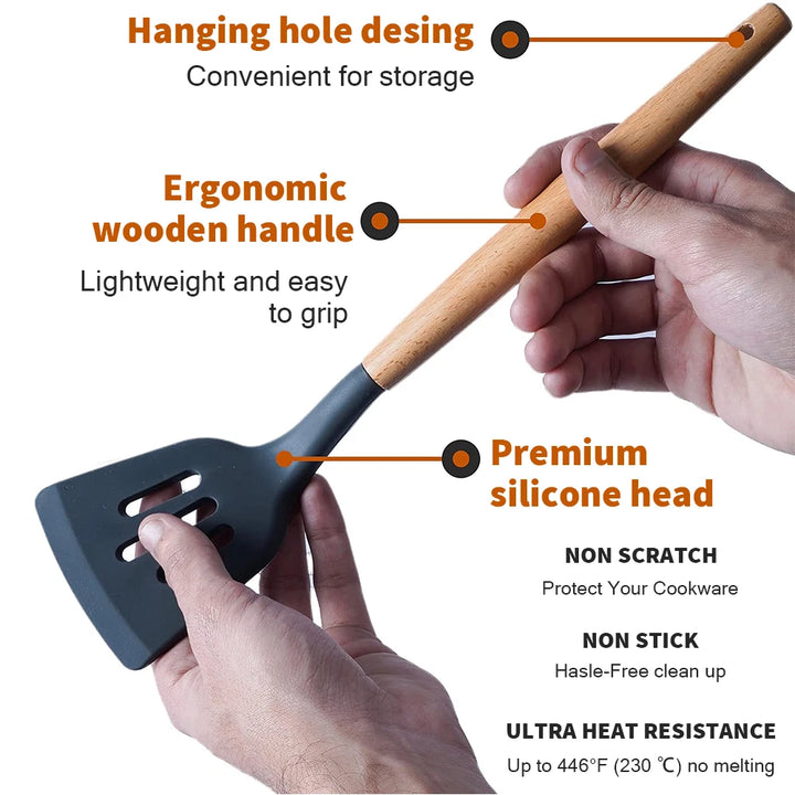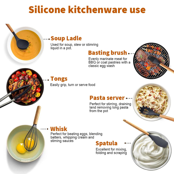 - Easy to Clean: .Washing hand recommend, The best way to clean these silicone cookware set is gently rinsing in warm water. All kitchen gadgets and tools are a combination of food-grade silicone head and wooden handle. The wooden handle is ergonomically designed which is very comfortable to use.