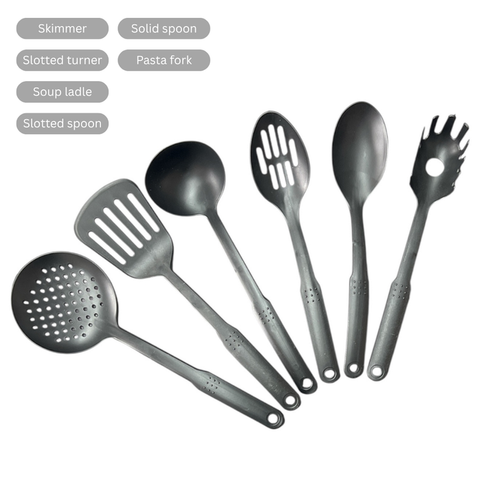 Kitchen Utensils: Skimmer, Slotted Turner, Soup Ladle, Slotted Spoon, Solid Spoon, Pasta Fork.