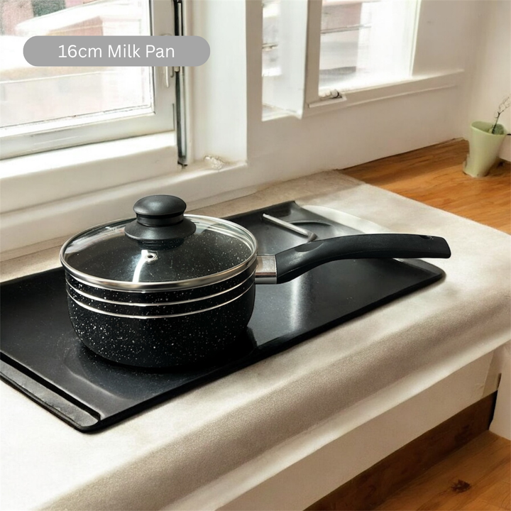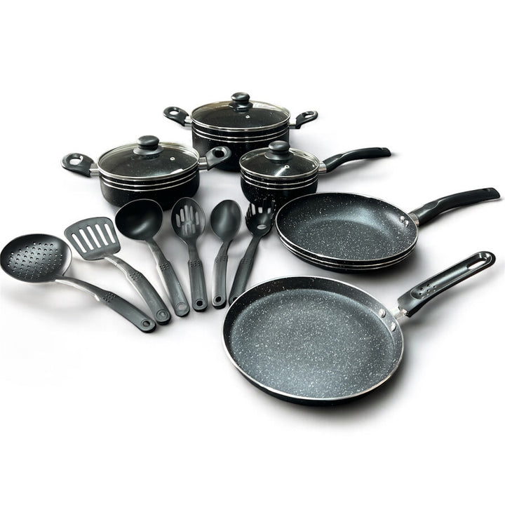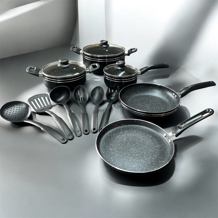 This 14-piece black non-stick ceramic cookware set combines durability and versatility for expert cooking. It includes a sauce pot, frying pan, milk pan, ladle, and spatula, all designed with a ceramic coating that ensures even heat distribution and easy food release. The set’s non-stick surface simplifies cleaning and reduces the need for excess oil, promoting healthier meals. Ideal for a variety of cooking techniques, this collection offers reliable performance and essential tools to elevate your kitchen experience.