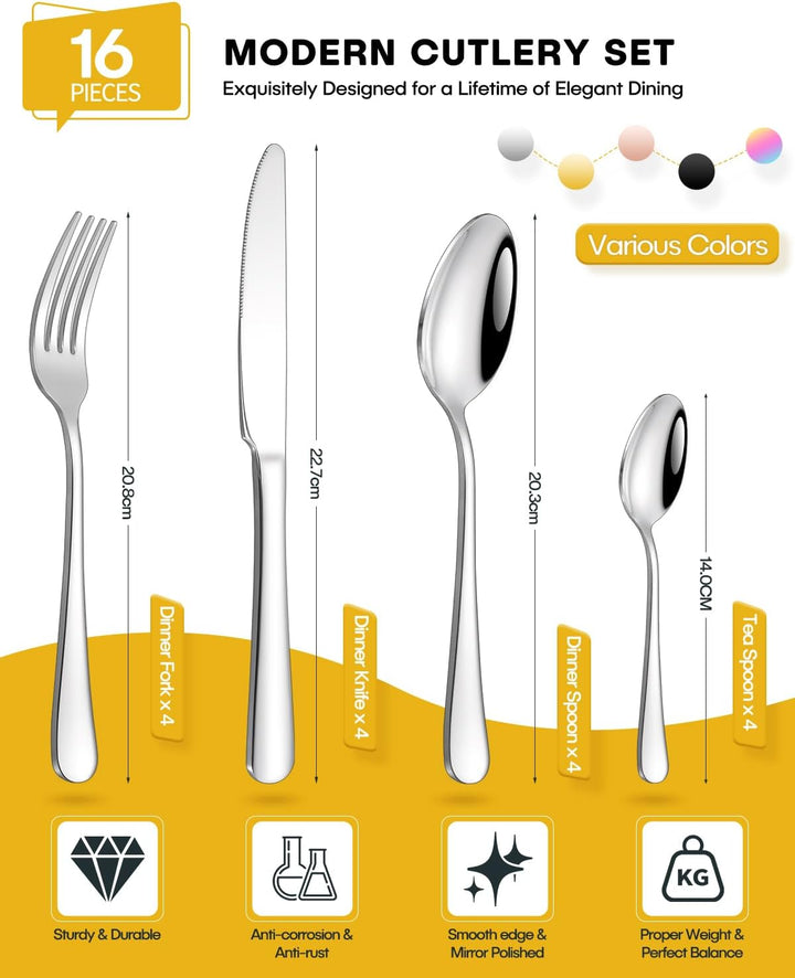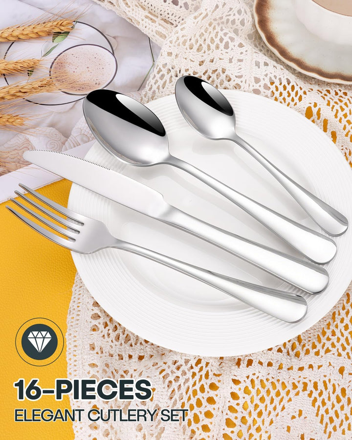 This 16 or 24-piece cutlery set is crafted from high-quality stainless steel, designed to serve 4 to 6 people with durability and style. Featuring a mirror-polished finish, each piece combines elegance with practicality, making it ideal for everyday use or special occasions. The set includes spoons, knives, and forks, all engineered for comfortable handling and long-lasting performance. Dishwasher safe for easy cleaning, this flatware set enhances your dining experience while maintaining its shine and integrity over time.