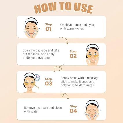 - 💓【How to use】: Open the package, take out the eye mask and apply it under the eyes or anywhere you need to apply it. (For example, between the eyes.) Then gently press and massage with the massage stick for better fit and absorption, and leave it on for 20 minutes or more. With its refreshing feel and dark circle removal effect, you'll find the moment you float this golden eye mask to be a relaxing and wonderful moment in your day.