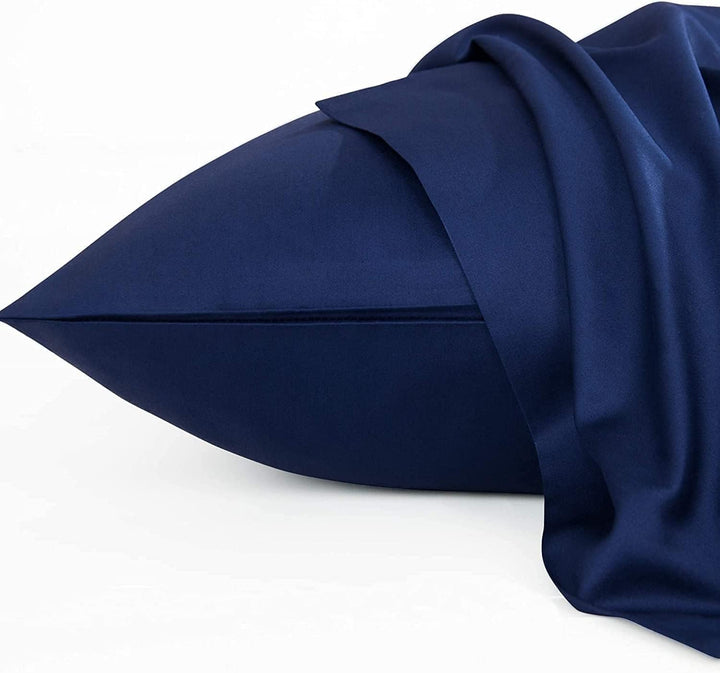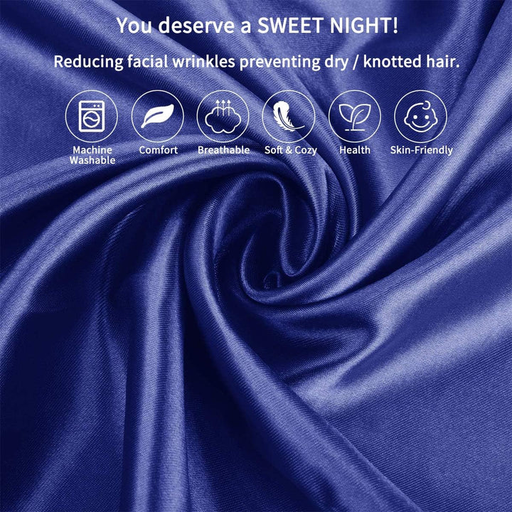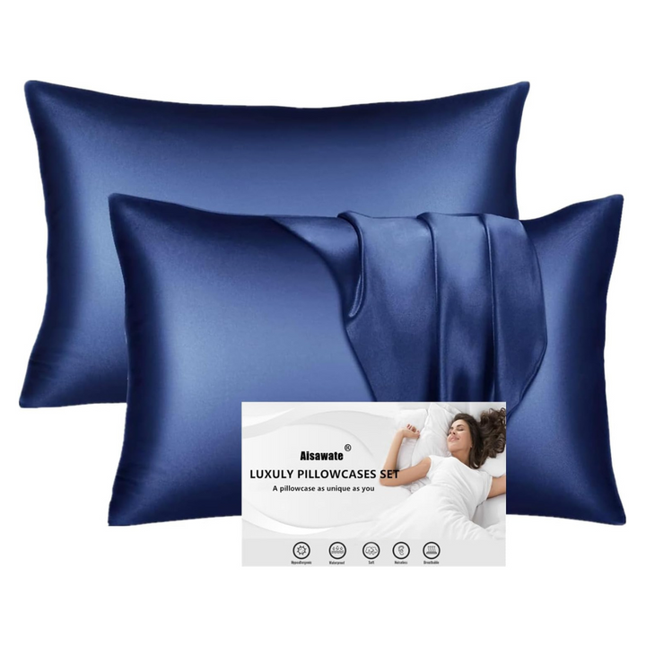Experience the luxury of our 2-piece set of navy blue satin pillowcases, each measuring 51x92cm. Crafted to be softer than silk, these pillowcases help reduce hair breakage and skin wrinkles by minimizing friction. Their anti-wrinkle and stain-resistant properties keep your bedding looking fresh longer. Designed with a secure envelope closure, they fit standard pillows perfectly, combining elegance with practical care for your hair and skin.