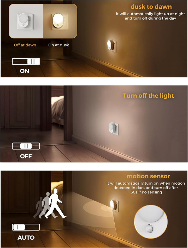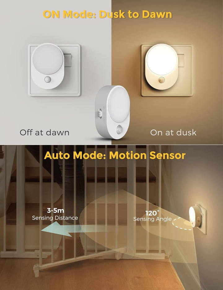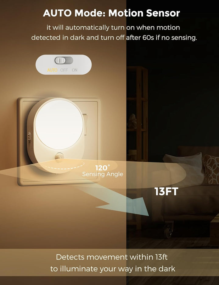 - 3 Lighting Modes: The plug in night light has a built-in motion sensor and 3 lighting modes. "On" mode - Dusk to Dawn Sensor; "Off" mode - turns off the light; "Auto" mode - automatically turns on when motion is detected in the dark (Sensing Range: 3-5M, 120°) and turns off after 60 seconds of inactivity.