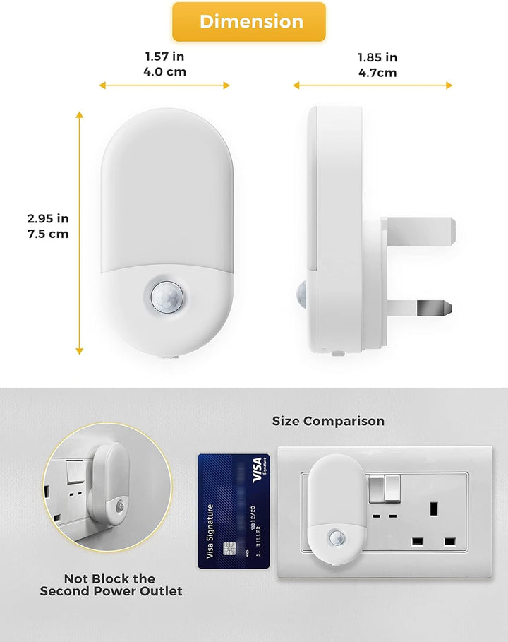 Enhance safety and convenience with this set of 2 motion sensor night lights, designed to plug directly into any wall outlet. Emitting a warm white 3000K glow, these lights provide gentle illumination ideal for bedrooms, children's rooms, or hallways. The built-in motion sensor activates the light upon movement, ensuring hands-free operation and energy efficiency. Perfect for families, these night lights help prevent trips and falls during nighttime, offering comfort and peace of mind for kids, babies, and adults alike.