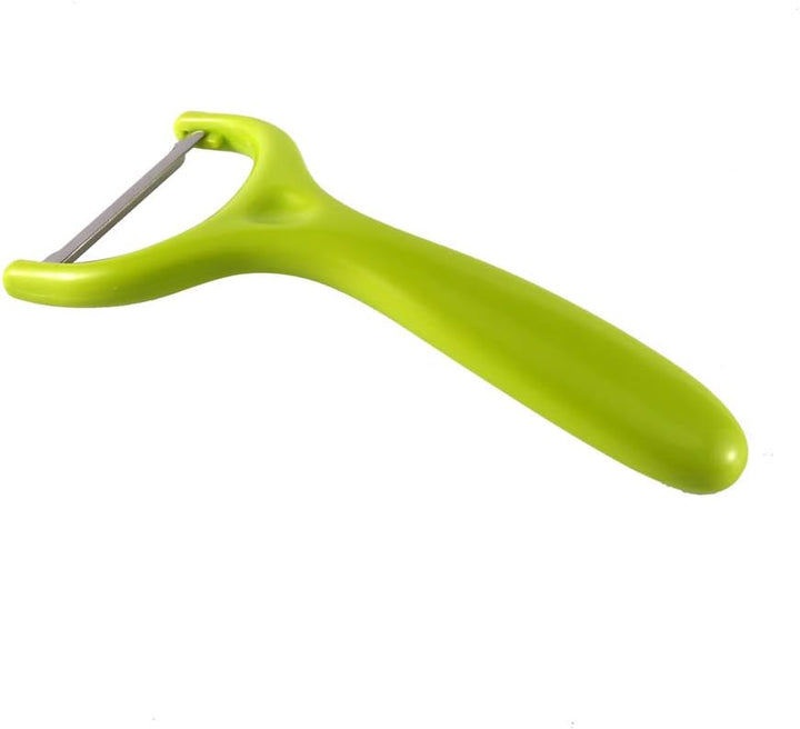 - Plastic handle is ergonomically designed for easy grip. Horizontal blade peels smooth-skinned fruits and vegetables quickly and easily.