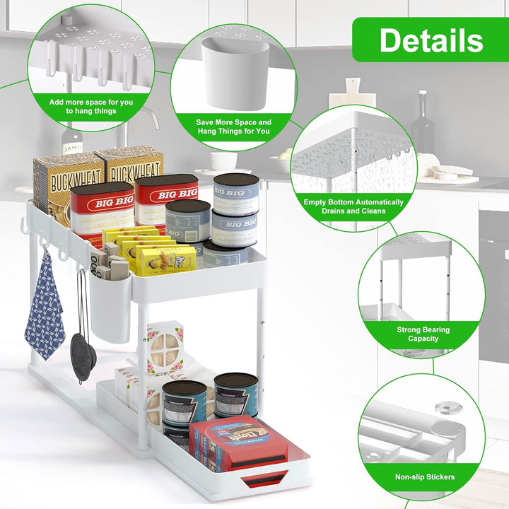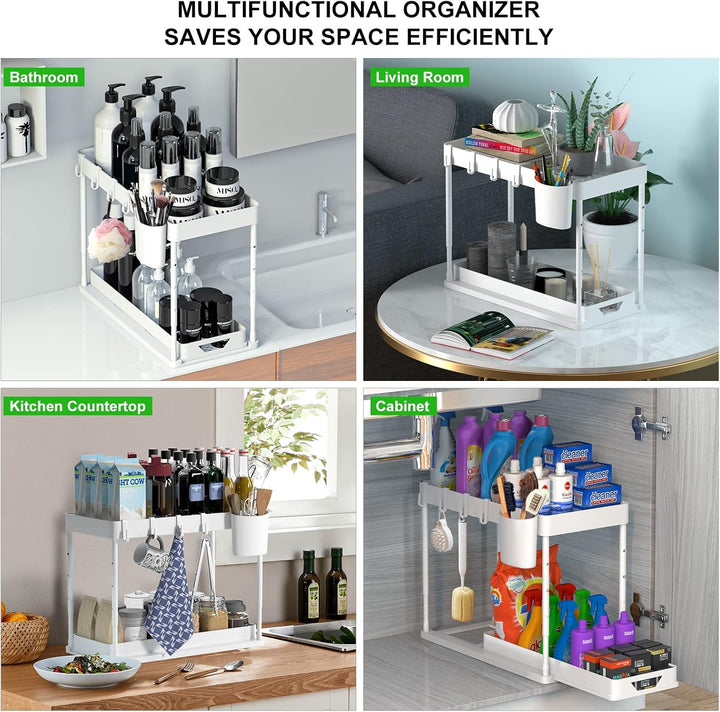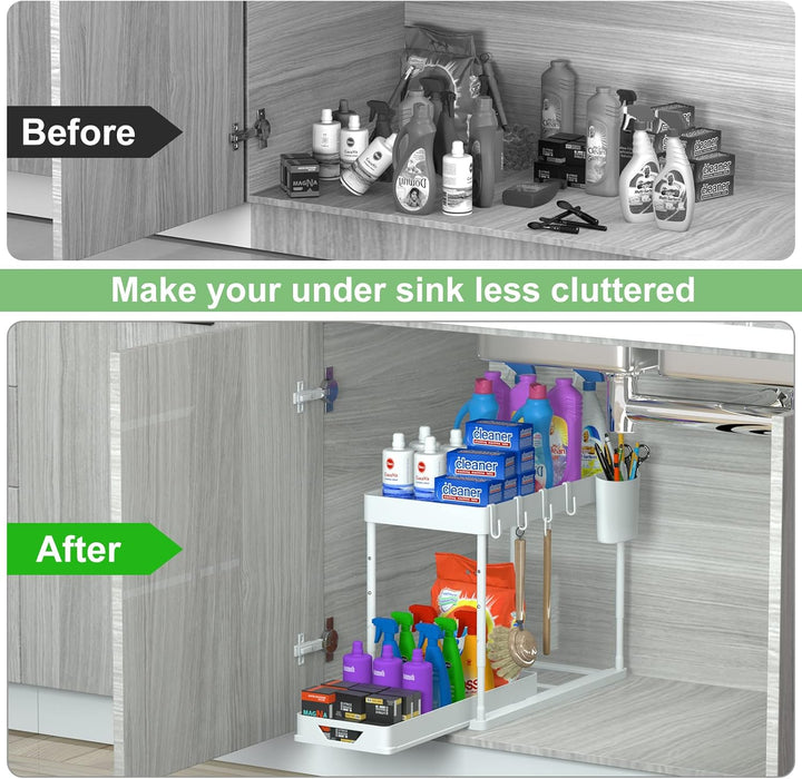 Optimize your cabinet space with this 2-piece set of white under-sink storage organisers. Featuring two tiers and smooth sliding drawers, these multi-purpose shelves provide easy access and efficient organisation for cleaning supplies, toiletries, or kitchen essentials. Designed to fit neatly under sinks or in cabinets, they help maintain a clutter-free environment while maximizing storage capacity. Durable and practical, these pull-out basket drawers simplify your daily routine by keeping items visible and within reach.