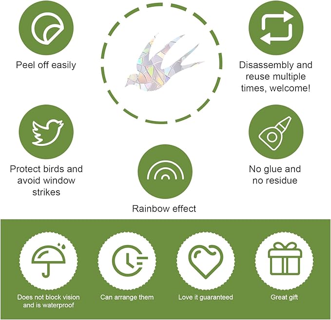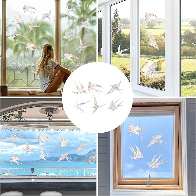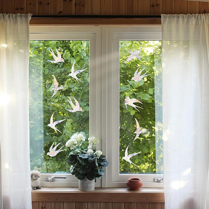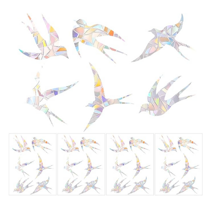 These 24 anti-collision window stickers are designed to prevent bird strikes by making glass surfaces visible to birds. Featuring swallow shapes with rainbow prism effects, they create a visual deterrent without adhesive, allowing easy application and removal. Ideal for protecting wildlife while maintaining window clarity, these stickers offer an effective, expert solution to reduce bird collisions on glass.