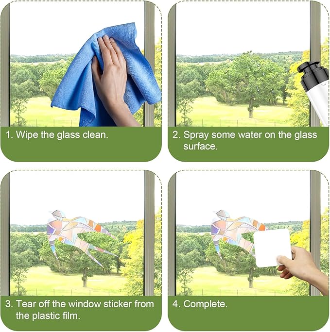 - Easy to Use: Remove the window stickers from plastic film, wipe off glass window, spray some water on it, lastly paste window stickers on window. Easy to apply and remove. When you no longer need them, just peel them off without leaving any residue or damaging your windows.
