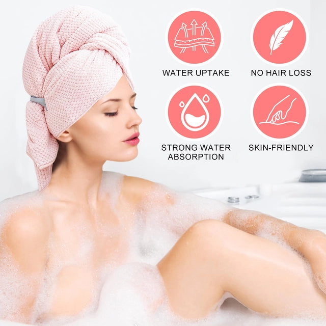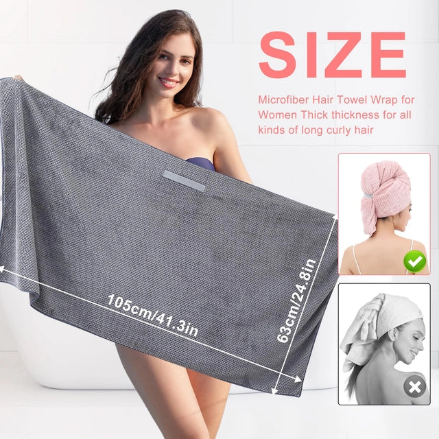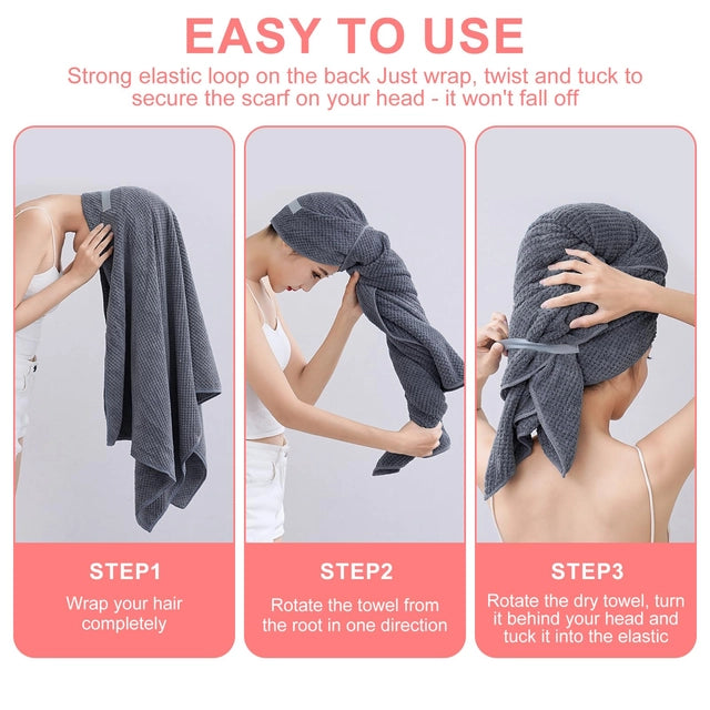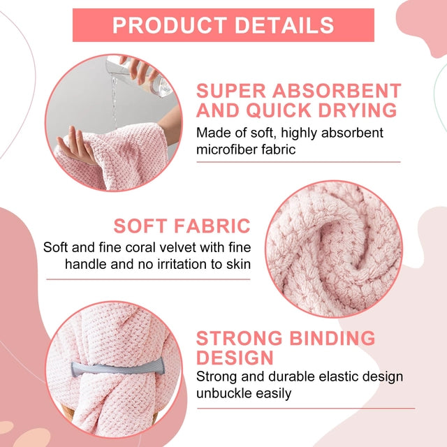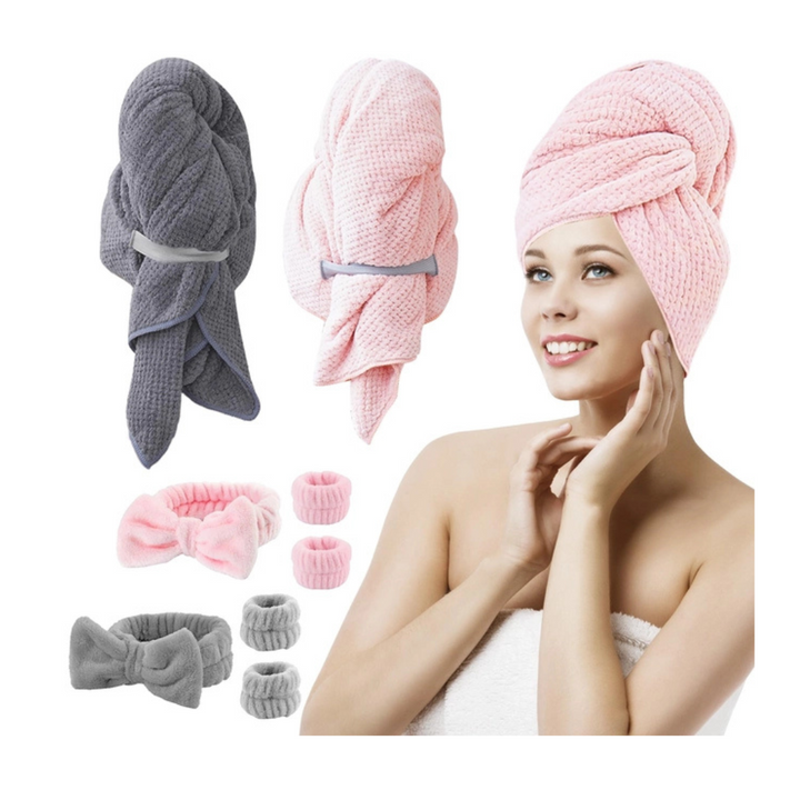 This comprehensive hair care set includes 2 large microfiber hair towel wraps (40 x 24 inches) with secure elastic straps and 6 absorbent headband/wrist washbands. Engineered specifically for women and girls with long or curly hair, the super-soft microfiber fabric dramatically reduces drying time while minimizing frizz and breakage. The ergonomic turban design stays securely in place, allowing for hands-free drying while you complete your post-shower routine.