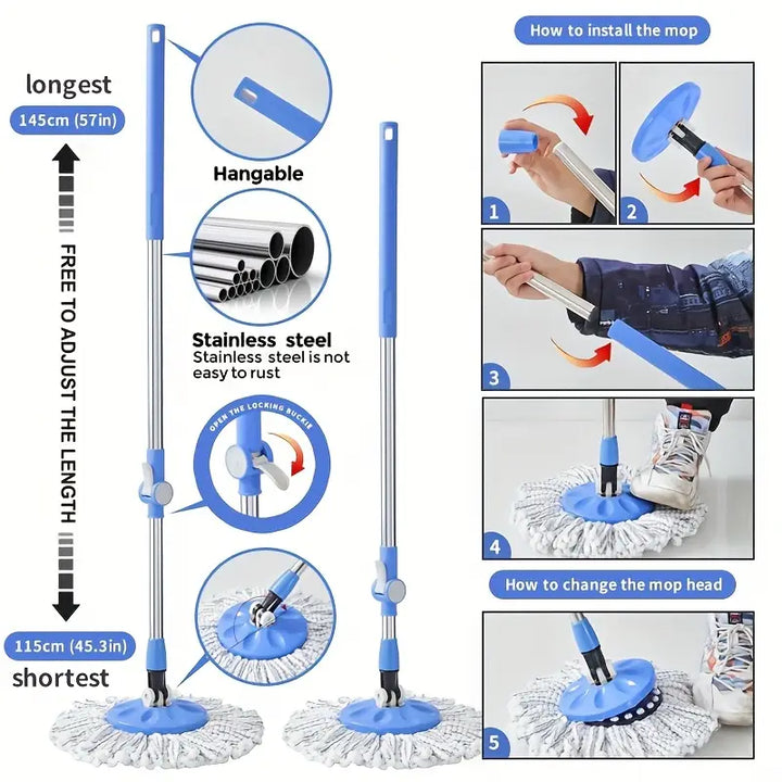 - 360 Rotating Washable Mop with sturdy stainless steel telescoping mop handle.