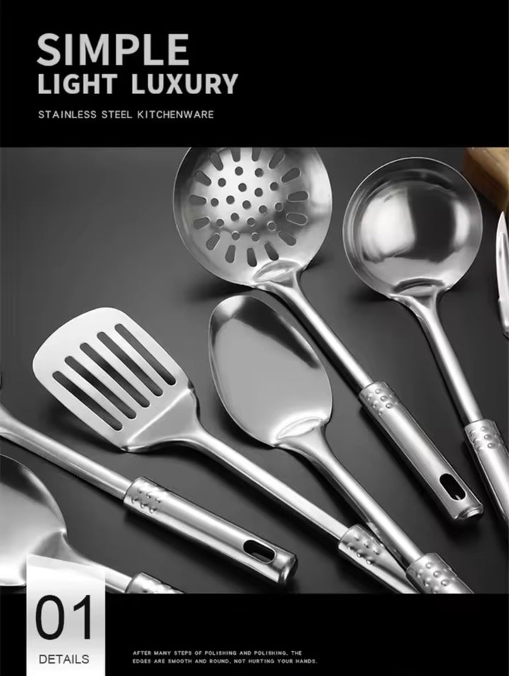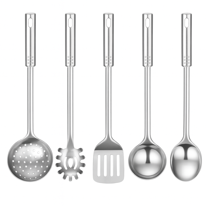 This 5-piece kitchen utensil set features stainless steel spoons, a shovel, and a spatula designed for versatile cooking tasks. Crafted from durable stainless steel, these tools offer long-lasting performance and resistance to rust. Their multi-functional design ensures efficient handling of various ingredients and cooking styles, making them essential for both everyday use and professional kitchens. The ergonomic construction provides comfortable grip and precise control, enhancing your cooking experience with reliable, easy-to-clean utensils.