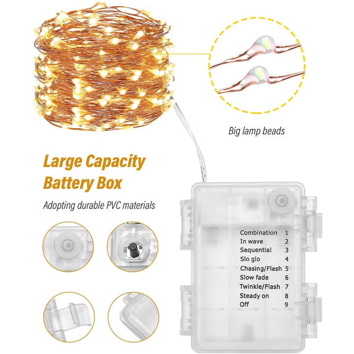 - Waterproof & Durable: Crafted with fine copper wire and a waterproof battery box, suitable for various weather conditions, ensuring long-lasting illumination.