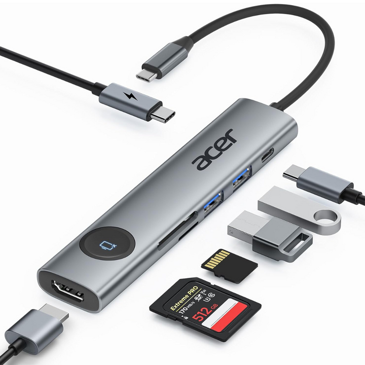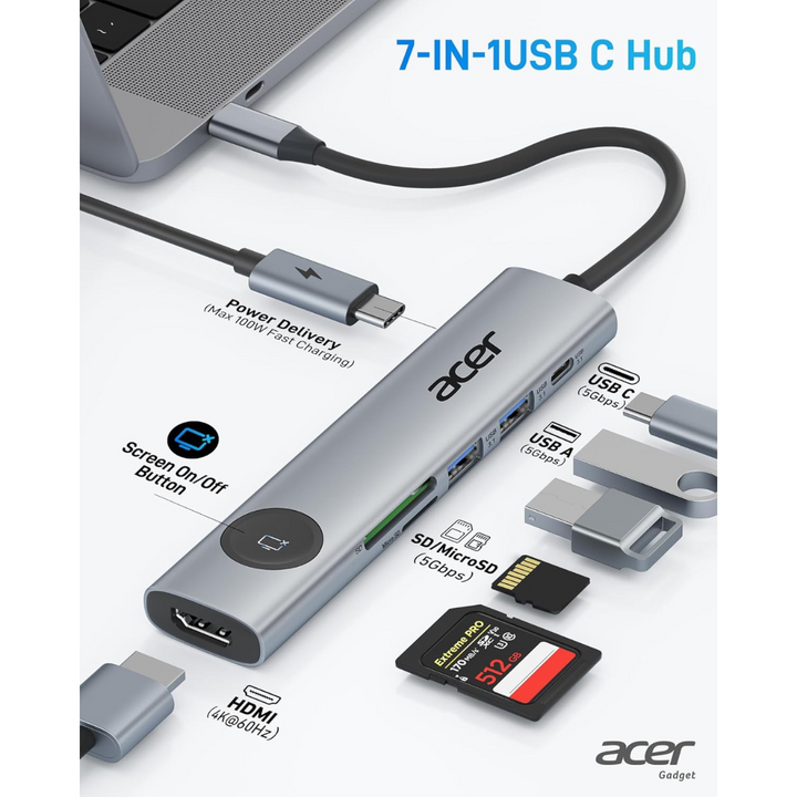 - [7-in-1 Multiport USB C Hub] acer USB C Hub is made of Aluminum material, expands a single USB-C port to 7 ports (1*HDMI 4K@60Hz, 2*USB 3.0, 1*USB-C Data Ports, 1*Type-C PD charging, 1*MicroSD card slot, 1*SD card slot). This USB C Adapter with 7 ports can entirely meet your work from home, office, or on the go.