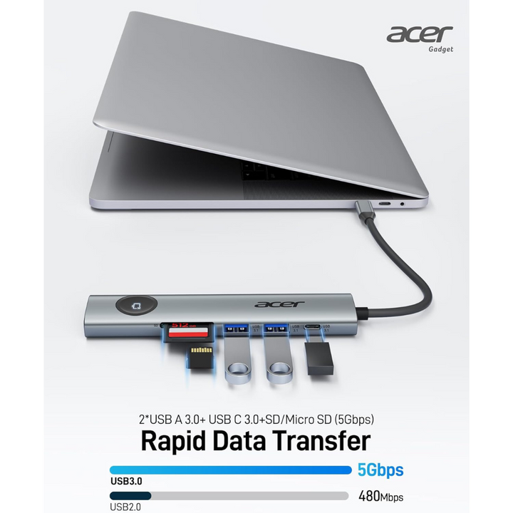 - [USB 3.0 + USB 2.0] acer All-in-One Hub for multiple devices has two USB 3.1 ports and one USB-C data transfer port, supports up to 5Gbps transfer speed, can easily connect external storage devices, keyboards, mouse, and other peripherals. Easily transfer photos, download high-resolution videos, or backup files.