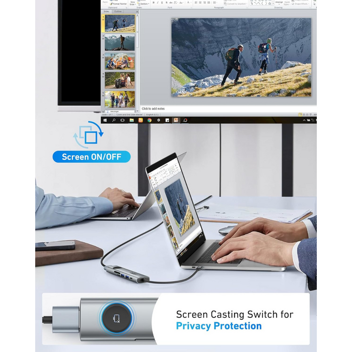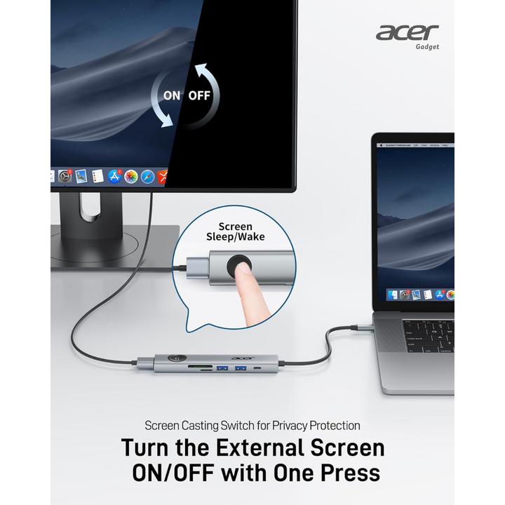 - [Privacy Protection Feature] acer USB-C Splitter's unique External Screen Sleep Button is convenient for office work. If you receive a private message, press the button to turn off the screen and mute the audio with just one click. After addressing your private matters, press it again to resume screen sharing, preventing potential embarrassment.