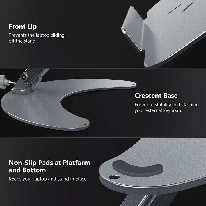 - STABLE AND SECURE: a crescent base provides you for more stability; a front lip and the pads secure your laptop in place, preventing it from sliding off stand; non-slip pads under the base keep the stand firmly in place without scratching your desk.