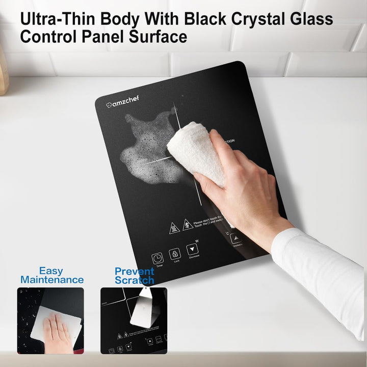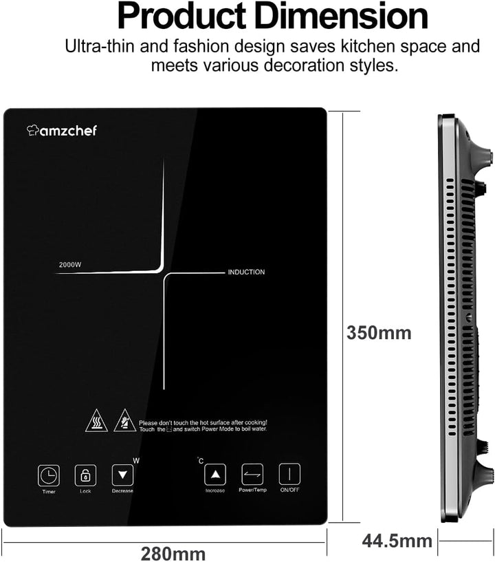 - 【Potable and Stylish Design】Black Frosted glass of induction cooker is attractive and stylish,being suitable for diverse styles of kitchen decoration.With sensitive large touch buttons, enhancing usability of single induction panel.Compact and lightweight with a thickness of just 2.17in (4.5cm) for easy transport and storage. AMZCHEF single induction hob is suitable for areas with limited space use.