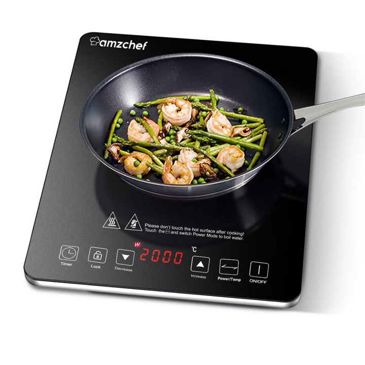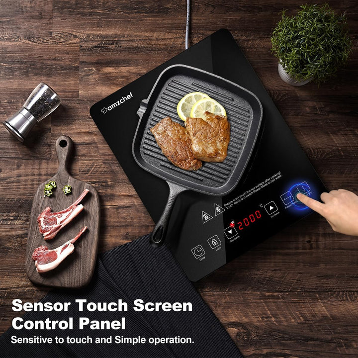 The AMZCHEF Single Induction Cooker combines sleek design with precise cooking control. Its ultra-thin profile and black frosted glass panel offer a modern aesthetic, while the touch sensor interface allows easy adjustment of 10 power and temperature levels. Equipped with a 3-hour timer and safety lock, it ensures both convenience and security during use. Ideal for efficient, controlled cooking in any kitchen setting.
