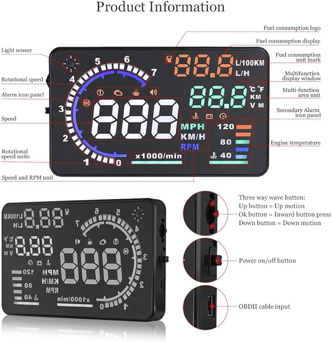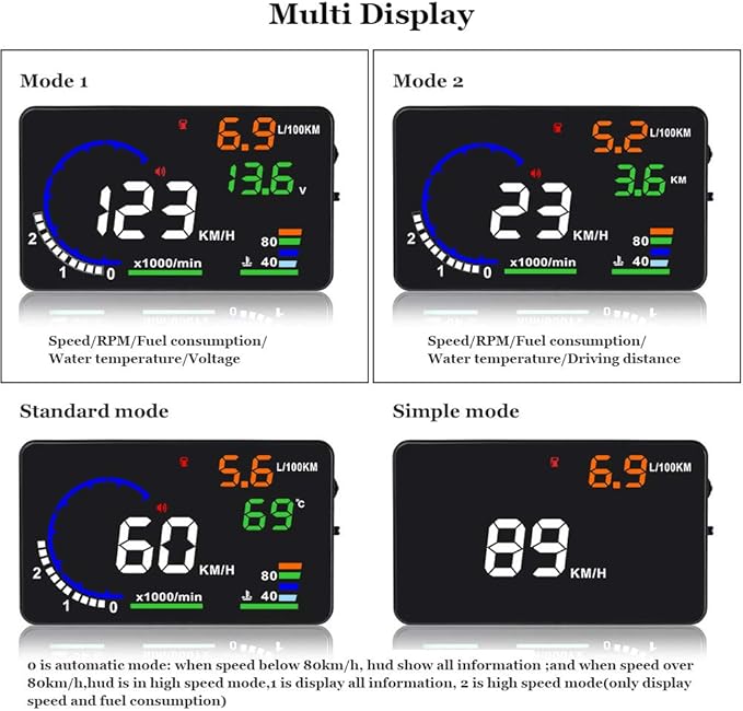 - *Advance Functions* This HUD supports over speed reminding, the icon of over speed will alarm and flicker when the vehicle exceeds the speed limit which set up in advance. Auto power on and off with vehicle started and shutdown, effective protection of the car battery; while retaining the manual switch mode, and more beneficial to control HUD