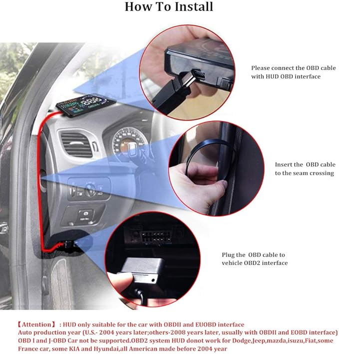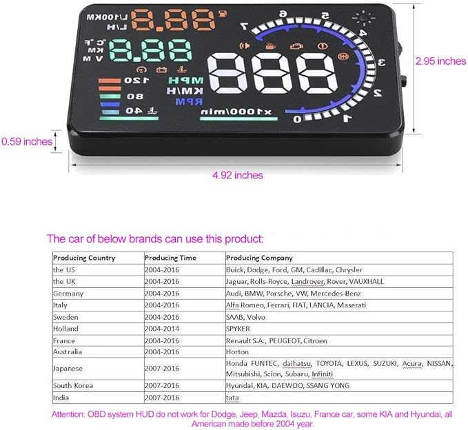- *Compatible Attention* 5.5 inches colorful large screen head up display. Available for most cars with OBD II or EUOBD, plug and play. It can works gasoline cars produced after 2004 in USA and after 2008 in other countries. It does not work for Dodge, Jeep, Mazda, Suzuki, all France and Italy cars, some KIA and Hyundai. The details of compatibility list please read the description below