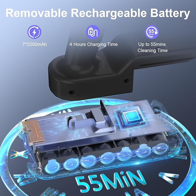 - 55 Mins Long Runtime for Extended Cleaning: Featuring a detachable 7*2200mAh battery, this cordless vacuum provides up to 55 minutes of cleaning time after a 4-hour charge. With three power modes, you can flexibly adjust the suction according to your different cleaning needs, ensuring efficient and worry-free whole-house cleaning with this vacuum cleaner cordless