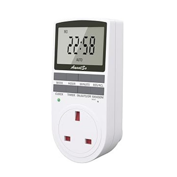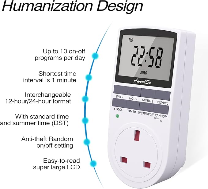 The Awootsv Digital Timer Plug Socket features an easy-to-read LCD display and supports 24-hour or weekly programming, allowing precise control over your home appliances and lighting. Designed for indoor use, this automatic timer switch enhances home security by enabling scheduled operation of devices, helping to save energy and provide convenience. Its reliable timing functions make it ideal for managing electrical equipment efficiently and safely.