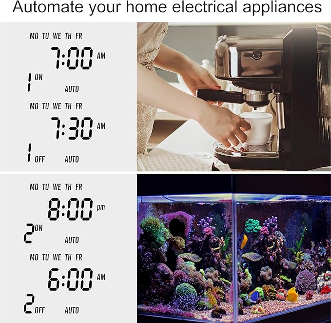 - Combos programme as required: Simply set your 24 hour plug in timer then insert it into the socket and connect your devices.You can set timer per individual day, or per sets of days, e.g. SAT-SUN, MON-FRI and some more combos which should be enough for anyone. Easy-peasy.