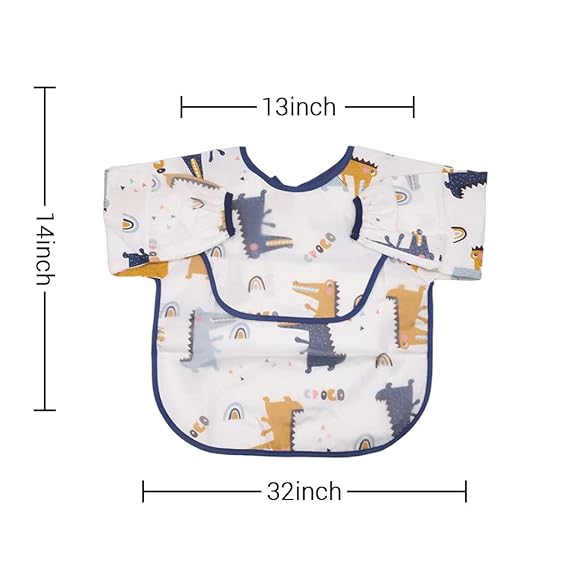 - Fits 6 TO 24 Months: For babies and toddlers; the crumb catcher / catch-all pocket helps contain spills; back tie closure; adjust sleeve length with elasticized cuffs; approximately 14? across the chest, 13 from neck down and 32? from cuff to cuff