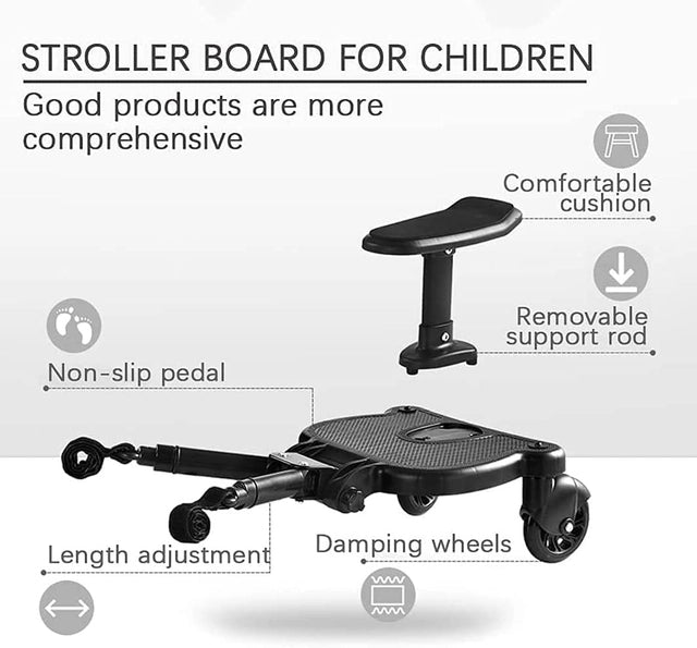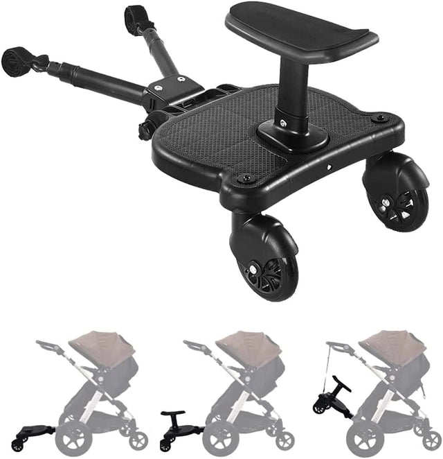 Transform your stroller into a versatile travel solution with our Black Buggy Board. Featuring a stable two-wheel design with a removable seat, this standing board accommodates toddlers who alternate between walking and resting. Engineered for universal compatibility, it securely attaches to virtually any pushchair model, providing a practical solution for parents managing multiple children during outings. The durable construction ensures reliable performance for daily use.