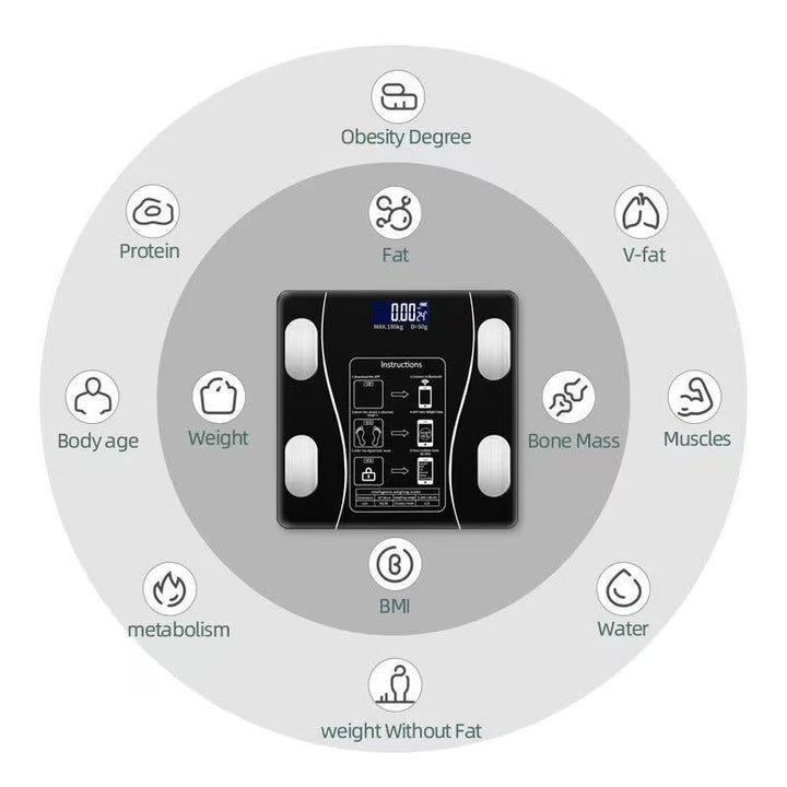 - Intelligent body fat scales can not only measure weight,but also body fat percentage, muscle percentage, bonemass water content, visceral fat index and other body data to help users have a more comprehensive understanding of their body condition.