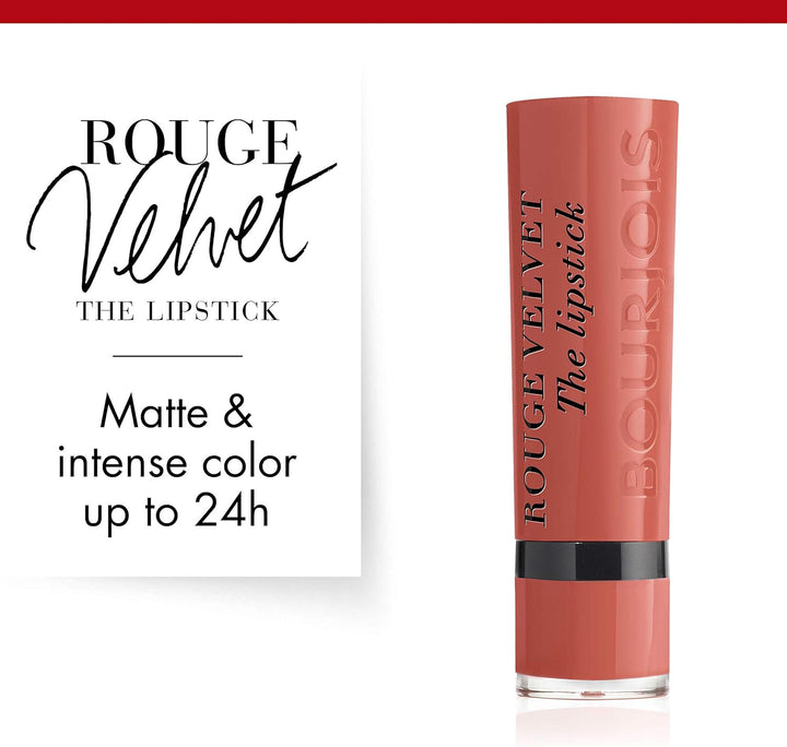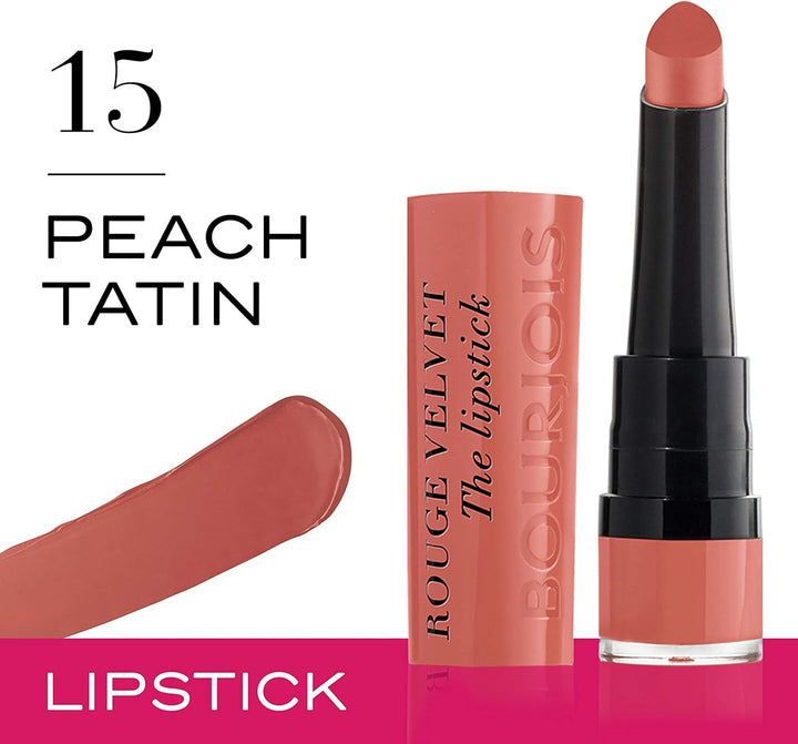 Bourjois Rouge Velvet The Lipstick Bullet in shade 15 Peach Tatin offers a rich, velvety matte finish with a lightweight feel. This 2.4g lipstick delivers intense, long-lasting color that enhances your natural lip tone with a soft peach nude hue. Its smooth texture ensures comfortable wear throughout the day, making it ideal for both professional and everyday looks.