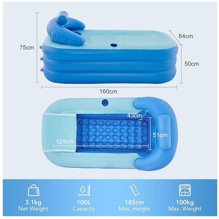 - A BREEZE TO USE – Pumps up the bathtub in less than 3 minutes. This inflatable tub has 3 integrated air holes which allow fast and easy inflation or deflation. It is suitable for most people, who are less than 6 feet (1.85 m) tall and weigh less than 220 lbs (100kg). To cope with different needs, it has a water capacity of 0.1 ton and can be used from -1 C to 50 C.