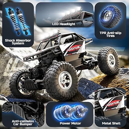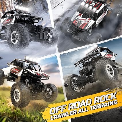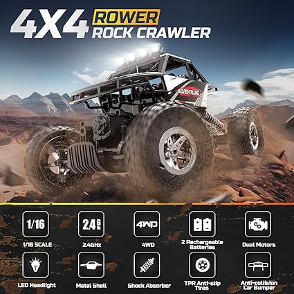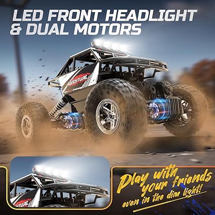 The DEERC DE45 1:14 Remote Control Truck is a powerful and durable RC car toy. With its 4WD off road capabilities and dual motors, it can conquer any terrain. The metal shell and LED headlights add to its realistic appearance. Enjoy up to 90 minutes of play time with this high-performance monster truck.