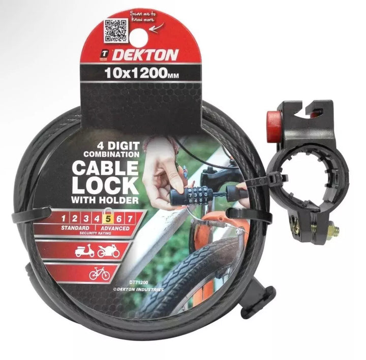 The Dekton 10x1200mm 4 Digit Combination Steel Cable Lock With Holder provides unbeatable security with its cut resistant steel cable and 4 digit combination lock. Keep your belongings safe and secure with this durable and reliable lock, perfect for bicycles, outdoor equipment, and more.