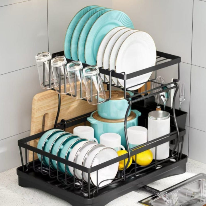 - 【2-tier dish rack】 - Double-layer shelf design - layered from top to bottom, side expansion, reasonable storage of your dishes, Chopsticks, cups and a variety of tableware. With a removable cup rack, you can hang it the place you want. Not only is it easy to drain, it also keeps the kitchen clean.