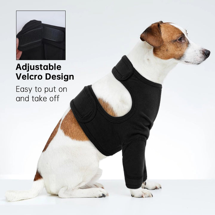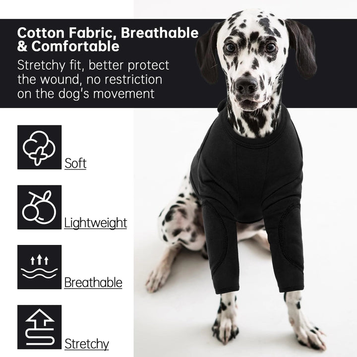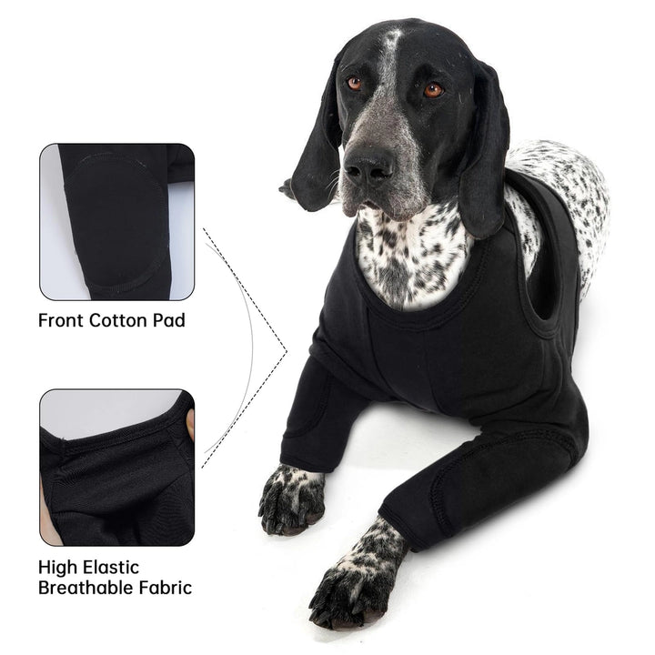 - 【Protection For Front Legs】Our dog recovery suit is made of soft, stretch-fit cotton that hugs your dog's body and provides optimal comfort and protection. Dog leg protector can prevent dogs from licking and protect dog's joints, wounds, hotspots, infection and skin problems.