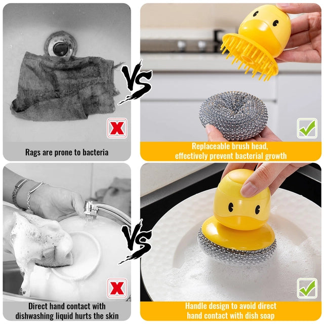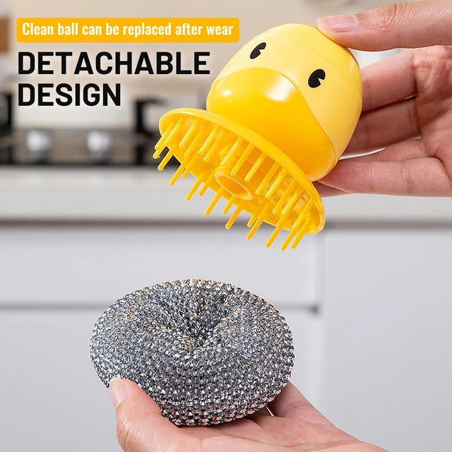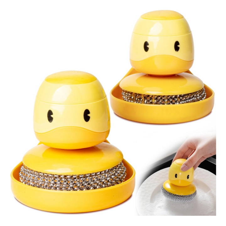 The Esdallina 2-piece set features yellow duck-shaped cleaning brushes designed for efficient dishwashing. Each brush includes a detachable cleaning ball and a comfortable handle, making it ideal for scrubbing dishes, pots, pans, and sinks. Its ergonomic design ensures thorough cleaning while minimizing hand fatigue, providing a practical and hygienic solution for everyday kitchen tasks.