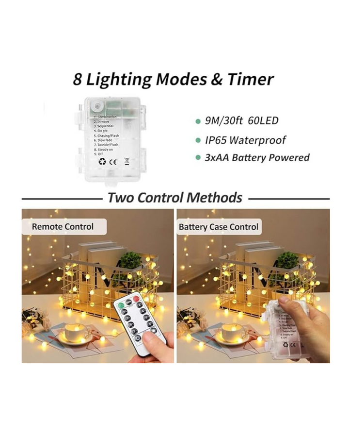 These battery-operated fairy lights feature 60 warm LED bulbs on a 30-foot waterproof string, perfect for both indoor and outdoor use. With 8 lighting modes, they offer versatile ambiance options to enhance your bedroom, holiday decorations, or any special occasion. Their waterproof design ensures durability, while battery operation allows for flexible placement without the need for an outlet. Ideal for creating a cozy and inviting atmosphere with expert-quality lighting.