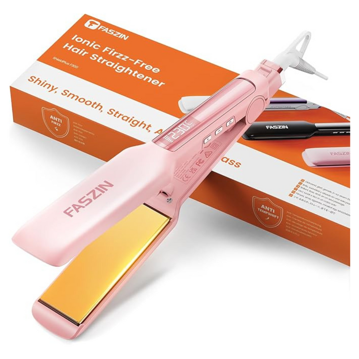 The Faszin Professional Hair Straighteners feature a 42mm wide titanium plate that ensures even heat distribution for smooth, sleek results. Equipped with negative ion technology, it reduces frizz and enhances shine. Rapidly heats up in just 30 seconds, offering 11 adjustable temperature settings from 130°C to 230°C to suit all hair types. The real-time temperature display allows precise control, making styling efficient and safe. Designed in an elegant pink finish, this flat iron combines professional performance with user-friendly features for expert-level hair care.