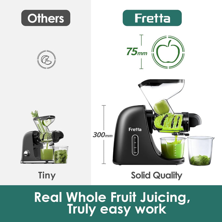 Discover the power of Fretta's Juicer Machines. With a 75MM wide dual feed chute, you can easily extract the nutrients from your fruits and vegetables. The slow masticating process ensures maximum juice yield, while the 2-speed modes and automatic reverse function provide versatility in your juicing. Available in sleek silver black.