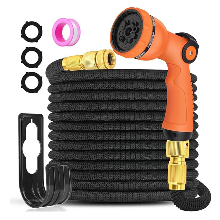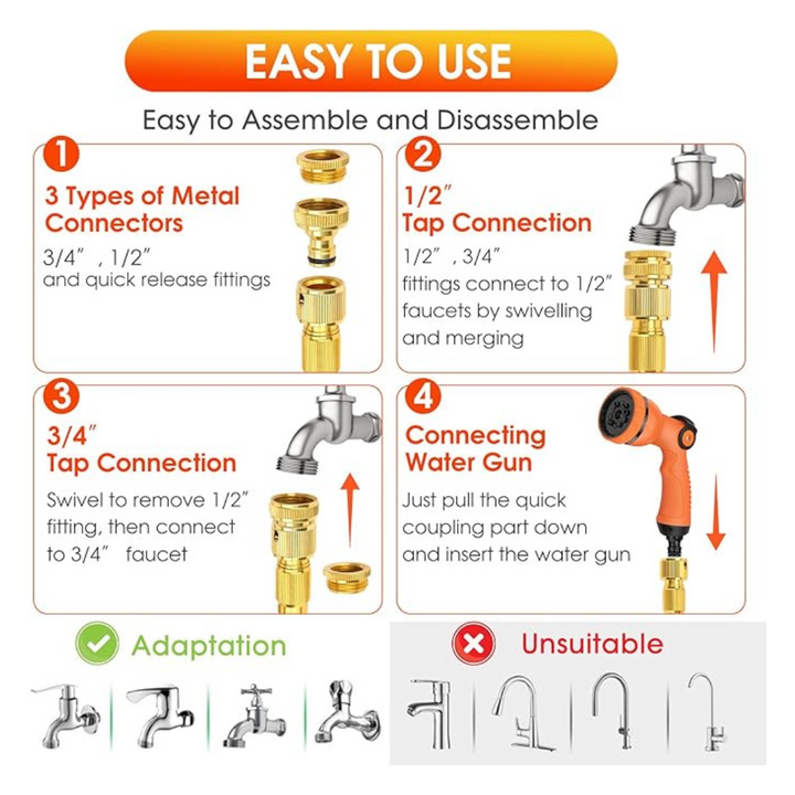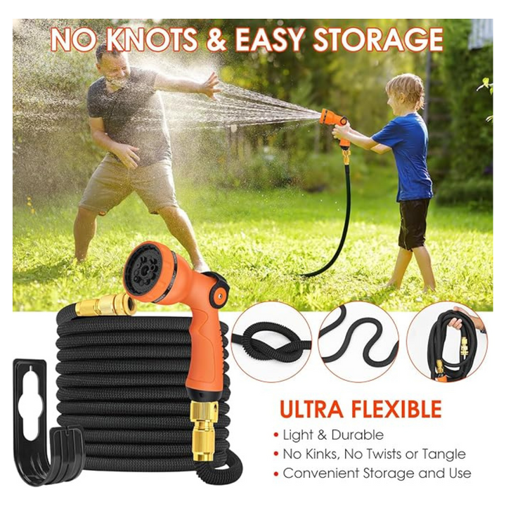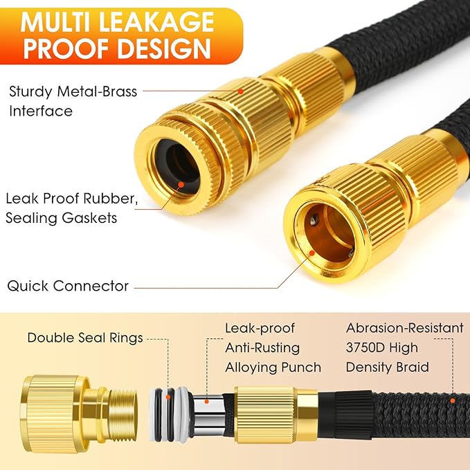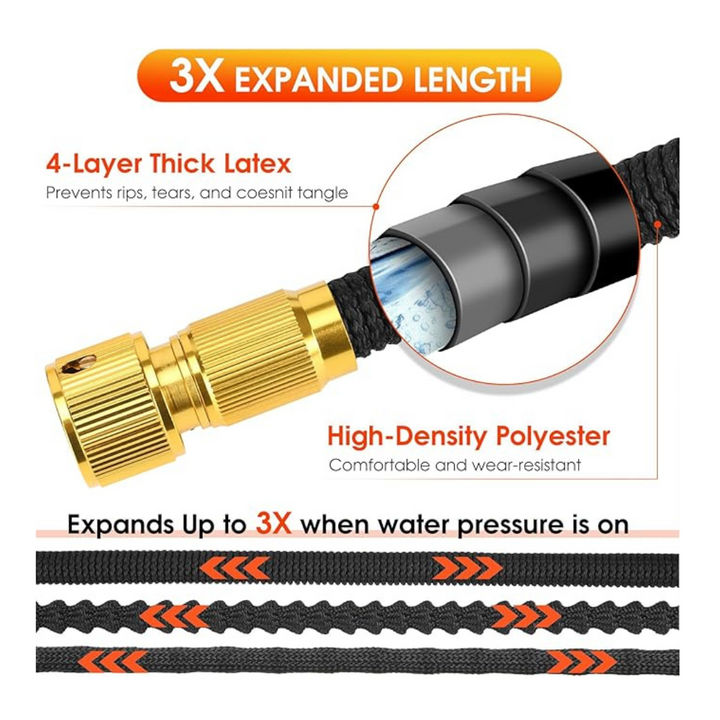 - Multi-Detail Support: Our flexible retractable magic hose is made with a durable natural rubber core to ensure that it won't kink, tangle or crease. The expanding hose also features upgraded brass fittings and thick rubber gaskets. No more worrying about rusty, leaking or cracked hose pipes that can waste water and damage your plants