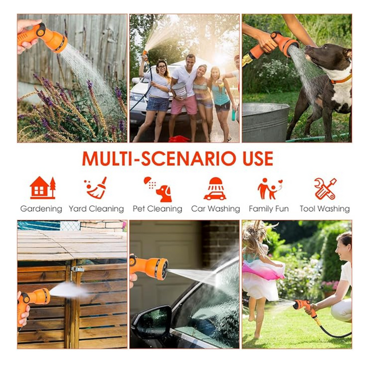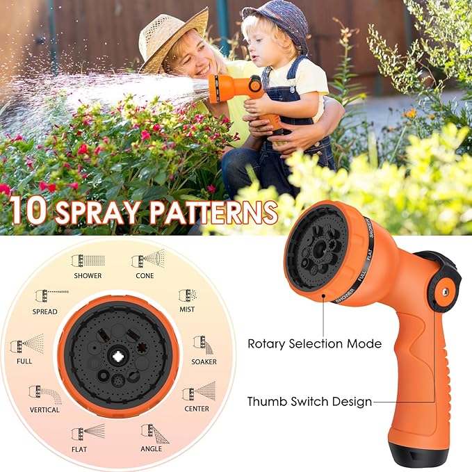 - 10 Function Gun: Our garden hoses are equipped with a spray gun with several different spray patterns for gardening/car washing/flower watering/vegetable watering/floor cleaning. Its ergonomic handle and thumb control switch design will make your gardening life easier and more convenient