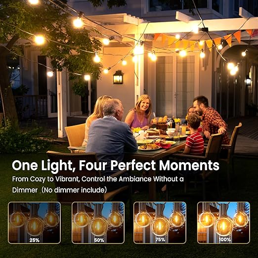 - 【Warm White Glow (2700K) for a Cosy Ambience】The 2700K warm white LEDs emit a soft, inviting glow—perfect for creating a relaxing atmosphere in your garden, backyard, or patio. Unlike harsh lighting, these bulbs provide a gentle radiance that enhances evening gatherings, weddings, or alfresco dining.