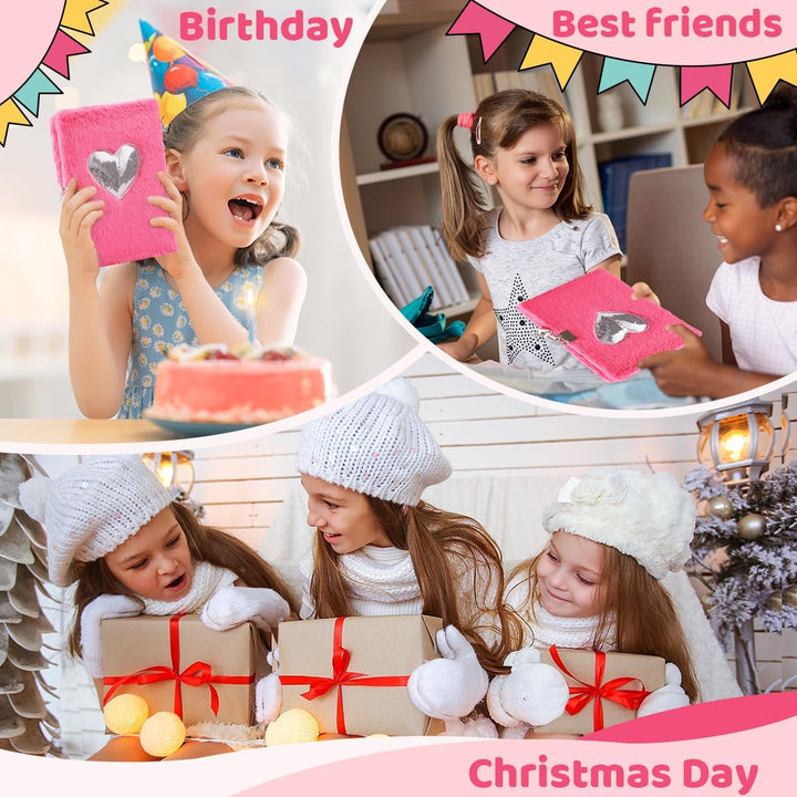 - The fuzzy diary with lock for girls contains 160 double-sided pages.The pages are thick enough to prevent ink bleed-through,ensuring a high-quality writing experience.The cute journal for girls is the perfect gift for birthdays,Christmas,or any special occasion.Suitable for children aged 6 and above,the notebook for girls makes the best present for daughters,nieces,friends,or sisters.Its charming design & practical features make it a precious present to inspire creativity