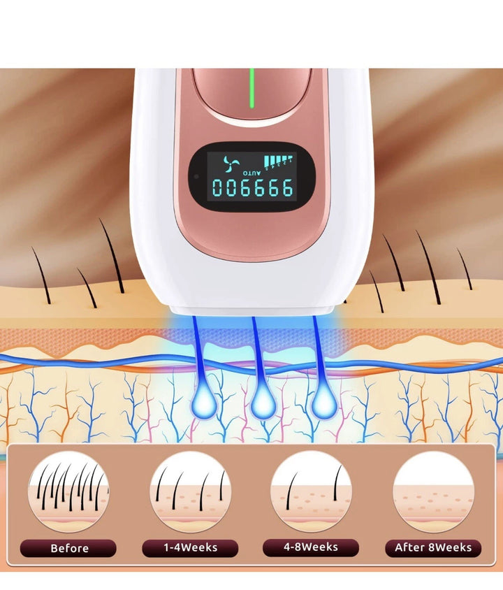 【FAST & PERMANENT IPL HAIR REMOVAL SYSTEM】The light hair removal equipped with New Upgrade IPL hair removal system, the hair follicles began to shrink, hair growth slowed, hair was reduced by more than 82% after 4 weeks. And the hair becomes significantly less and thinner in 6 weeks treatment. And after 8 weeks, you don't have to have regular treatment, just say goodbye to repeated treatment and unwanted hair growth,enjoy smooth permanently hair-free skin.