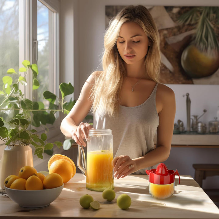 This 10.1oz glass lemon juicer features a sturdy handle and a precise pour spout for effortless juice extraction and transfer. Its manual design allows complete control over juicing, while the durable glass construction ensures clarity and easy cleaning. Ideal for fresh citrus juice preparation, it combines functionality with expert craftsmanship for consistent results every time.
