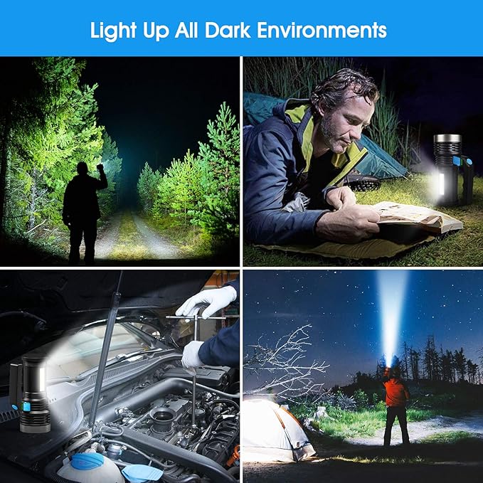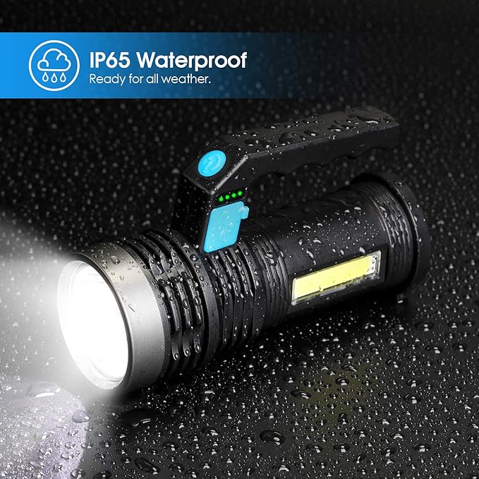 - 【Searchlight & COB Work Light】3 LED modes (high/ low/ strobe) and COB mode, this flashlight can be used as standard torch, searchlight and work light. Very bright for emergency, home, camping, fishing, hunting, walking dog, etc.